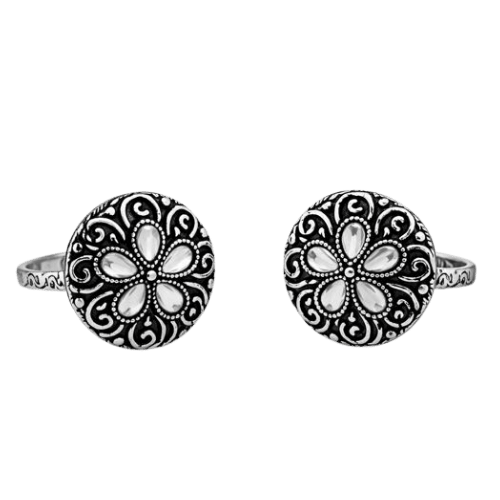 Upgrade your ethnic jewelry collection with Silkeon™ Vintage Oxidized White Floral Toe Ring Pair. Adjustable oxidized silver toe rings with elegant white floral design—perfect for daily wear, festivals, and gifting.
