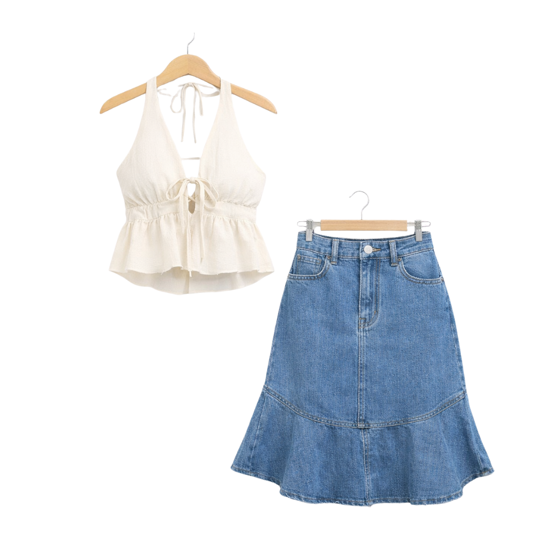 The set features a soft off-white halter neck top with adjustable tie-up detailing and a subtle flared hem, paired with a high-waist blue denim skirt finished with a stylish flared bottom. The silhouette flatters the waist while offering comfort and effortless movement.